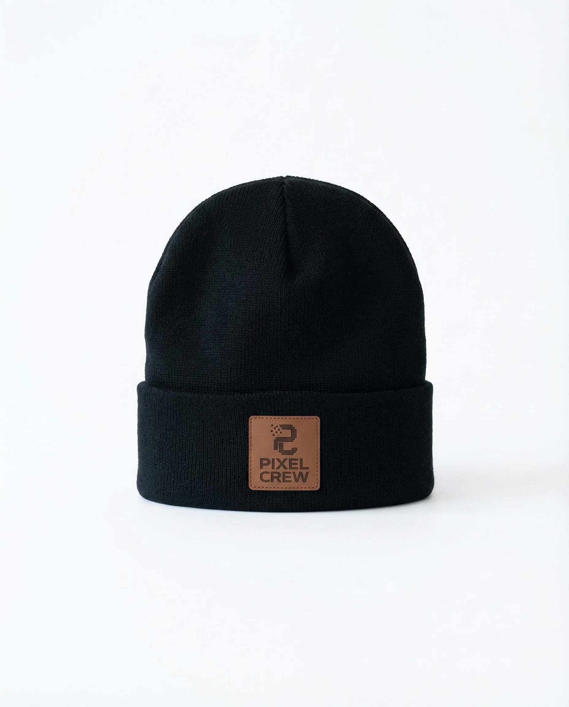 Black ribbed knit beanie with brown leather PIXEL CREW patch. Acrylic/wool blend. One size fits all.