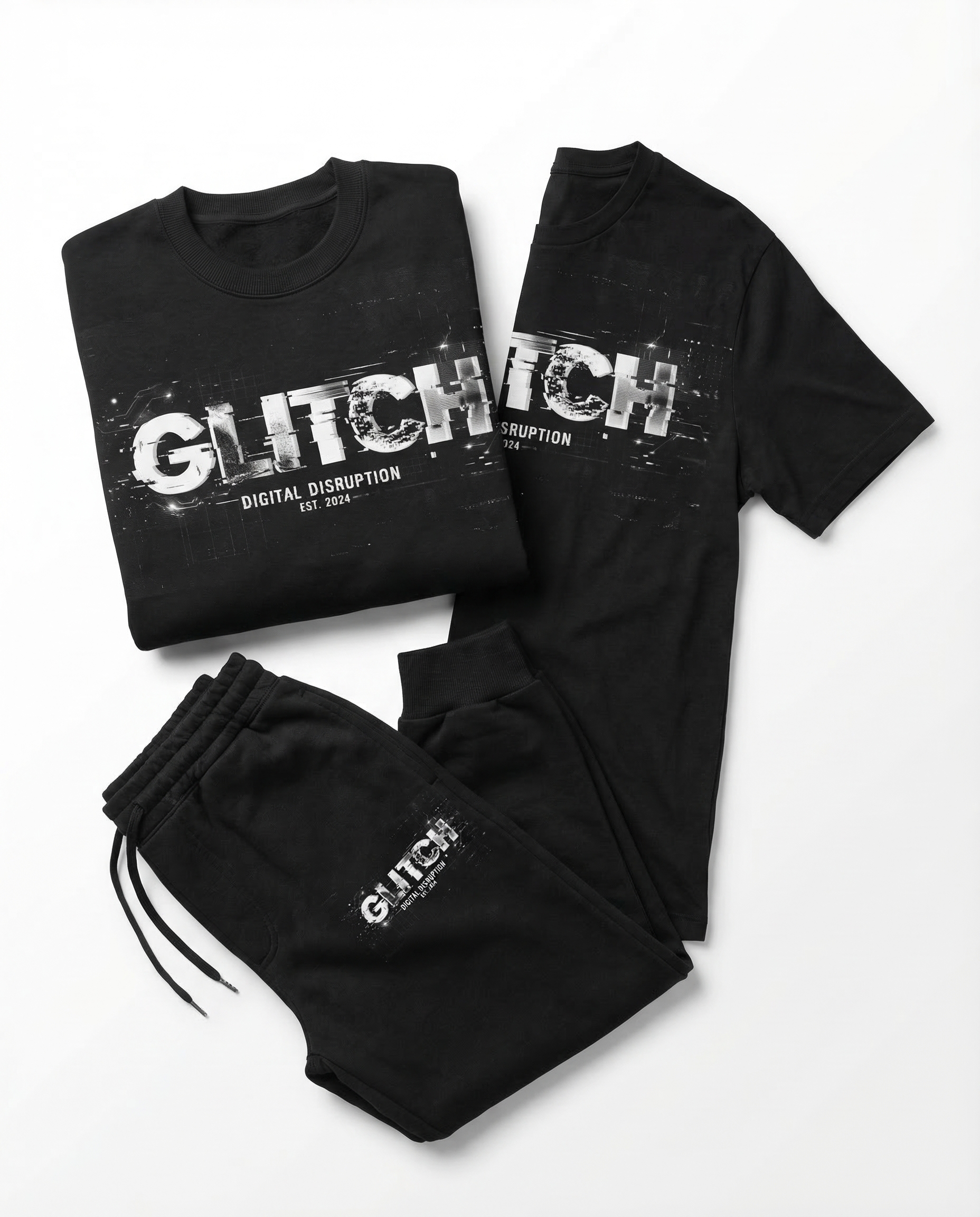 Crewneck sweatshirt + matching T-shirt + joggers — all in black with the GLITCH "Digital Disruption Est. 2024" print. Full streetwear set.