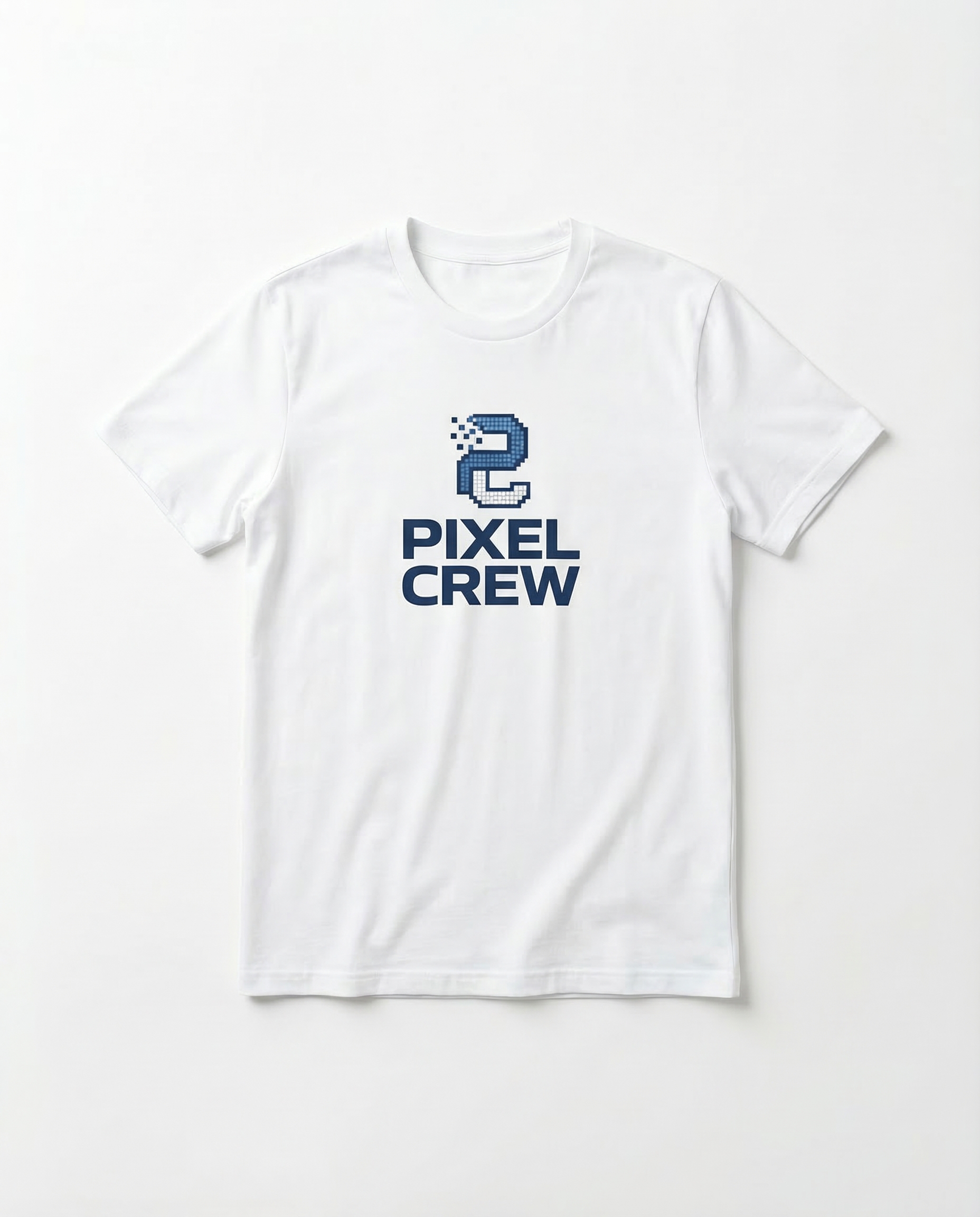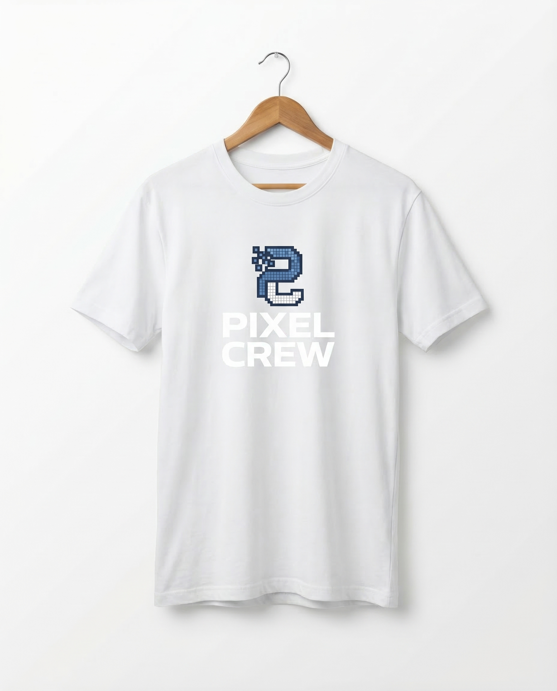 White premium cotton tee with blue pixel art logo and navy "PIXEL CREW" print. Clean, minimal aesthetic. Unisex regular fit.