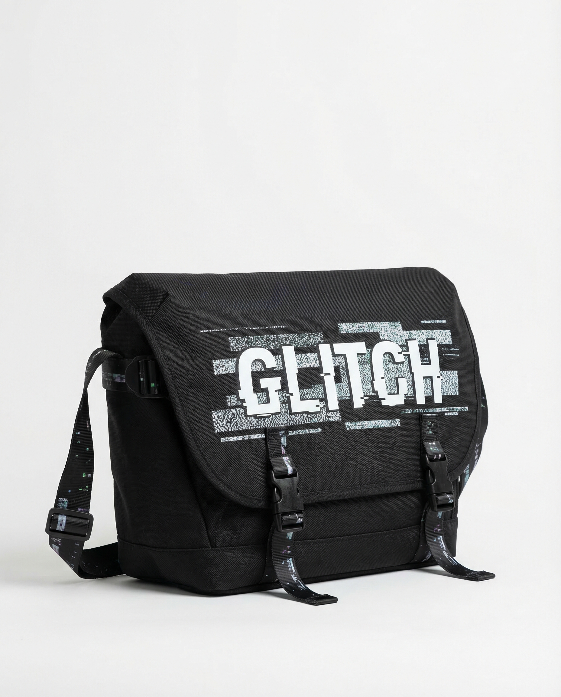 Black nylon messenger bag with static-noise WARSAW GLITCH print. Buckle closure. Adjustable glitch-pattern strap. Padded laptop compartment (fits 15").