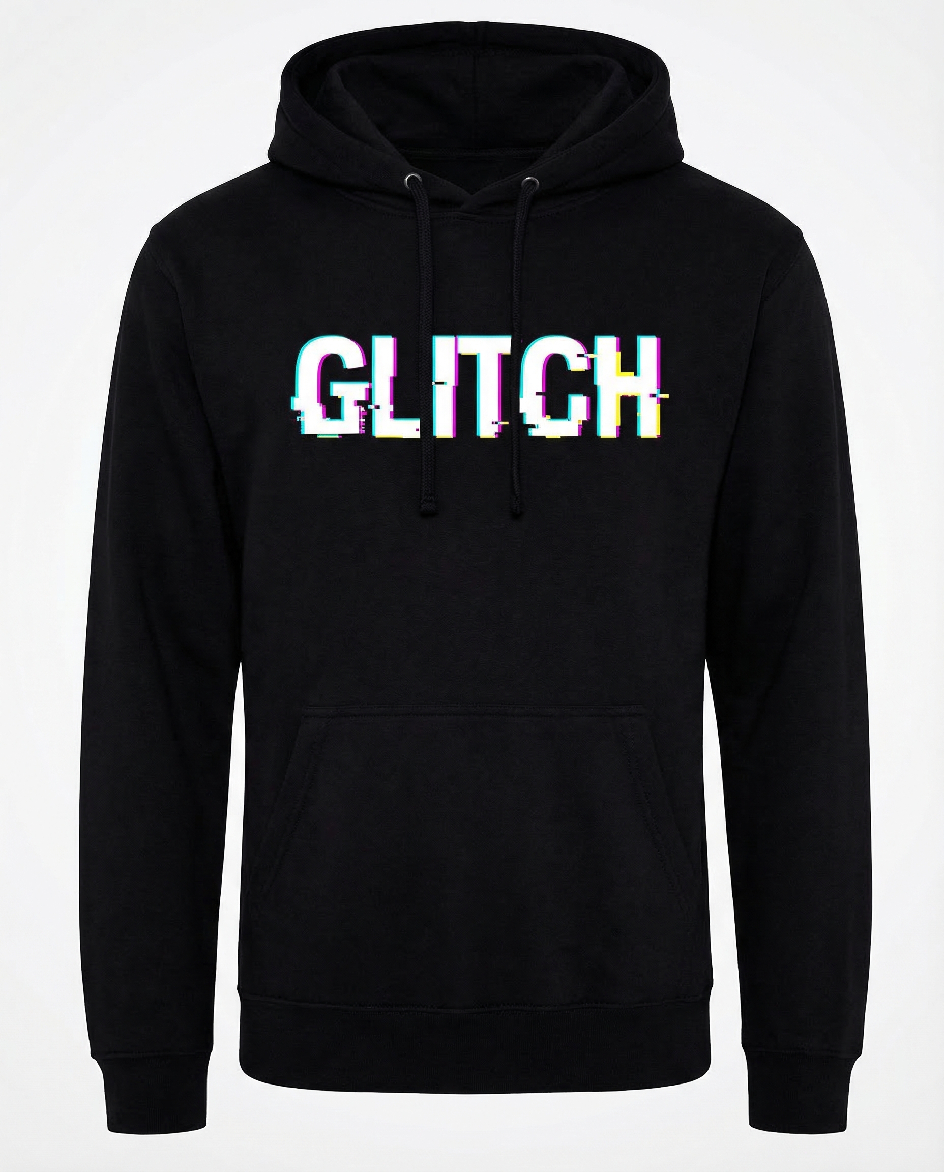 Black heavyweight hoodie with cyan/magenta/yellow glitch logo print. The signature festival colorway. Oversized fit.
