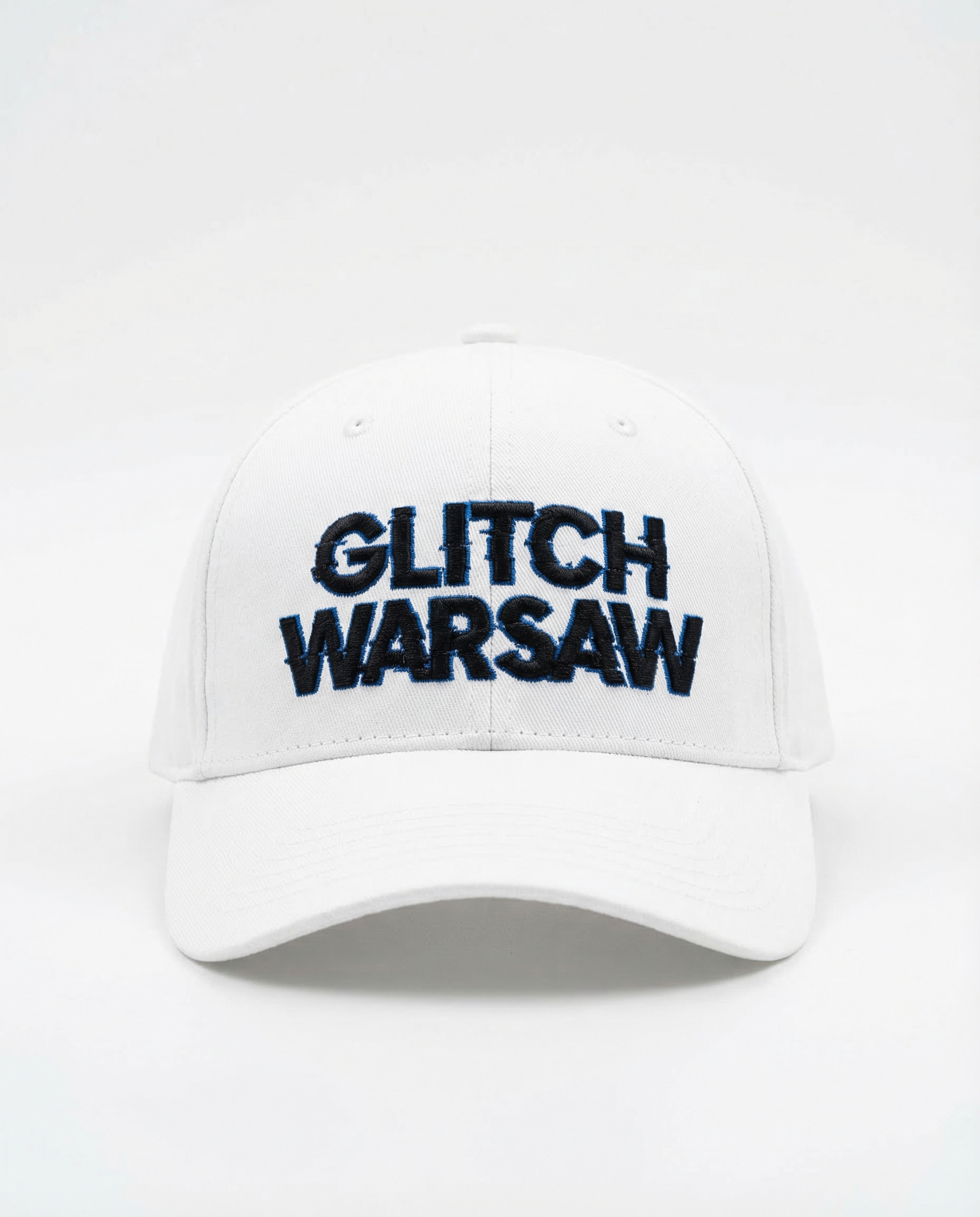 White structured six-panel cap with 3D embroidered "GLITCH WARSAW" in navy. Adjustable strap. Premium cotton twill.
