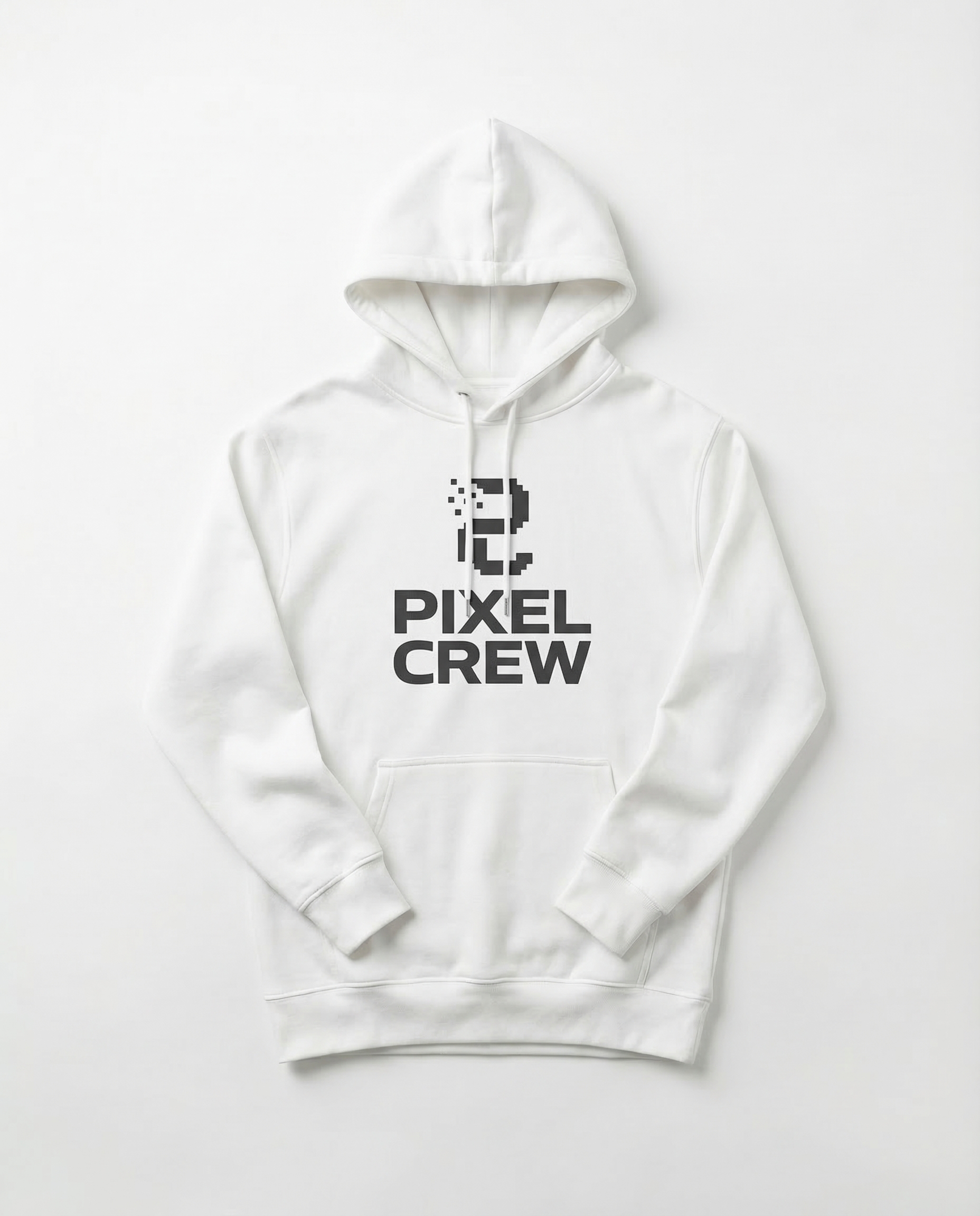 White variant of the Pixel Crew hoodie with black pixel art logo. Clean streetwear look. Oversized fit.