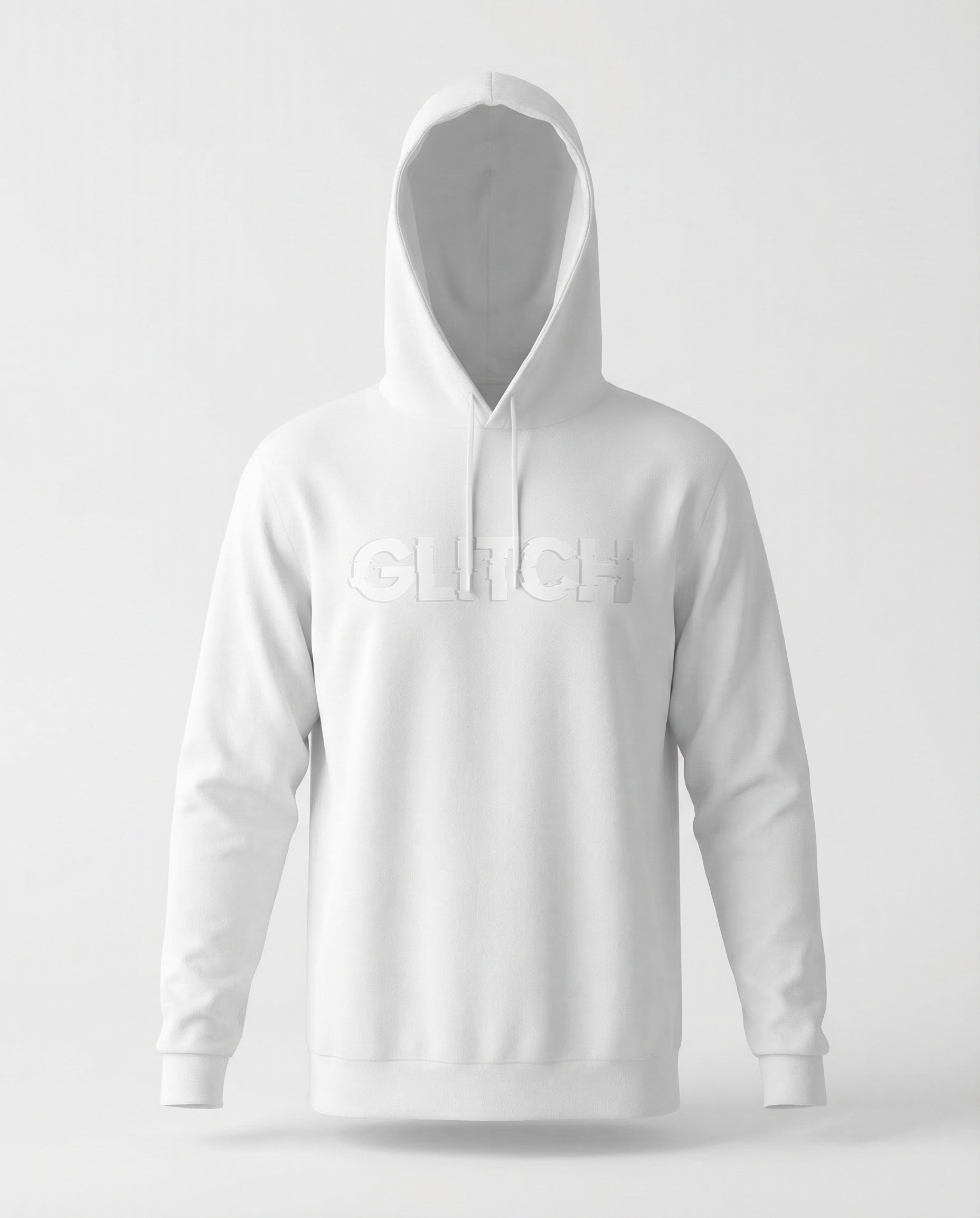 White 400gsm heavyweight hoodie with tonal embossed WARSAW WARSAW GLITCH logotype. Oversized fit. Kangaroo pocket. Premium brushed fleece interior.