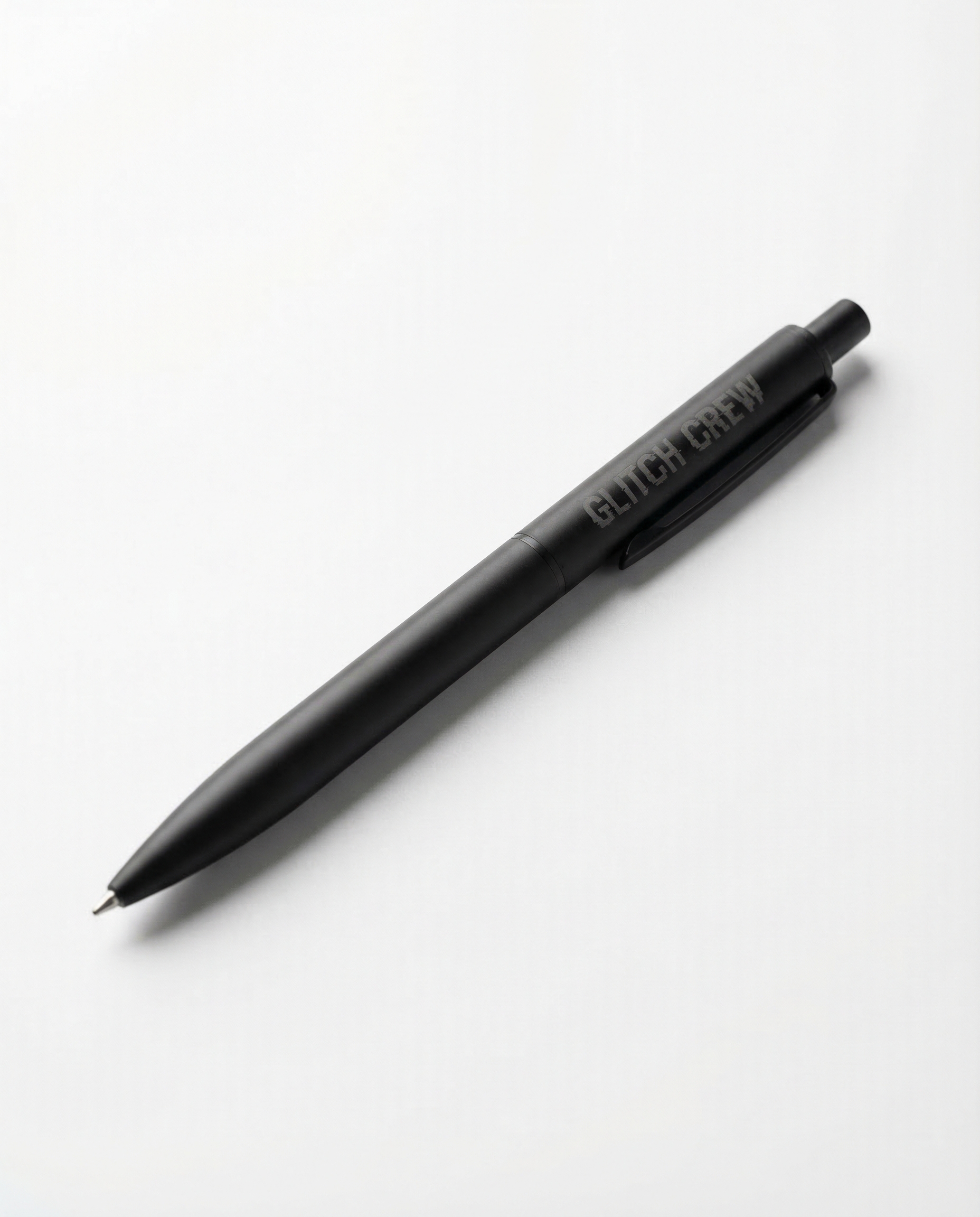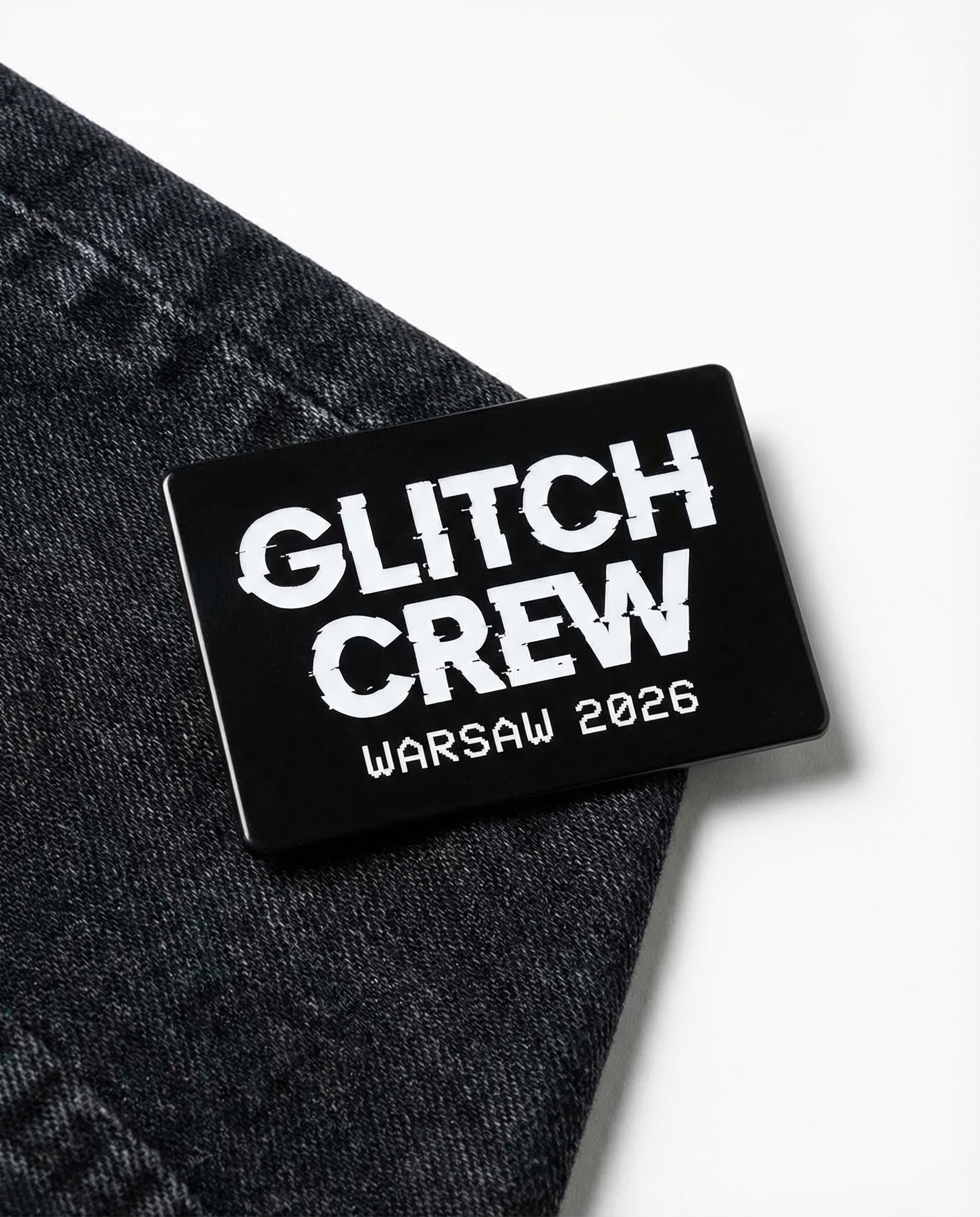 Black enamel pin with white "WARSAW GLITCH CREW — WARSAW 2026" text. Butterfly clutch backing. Collector's item.