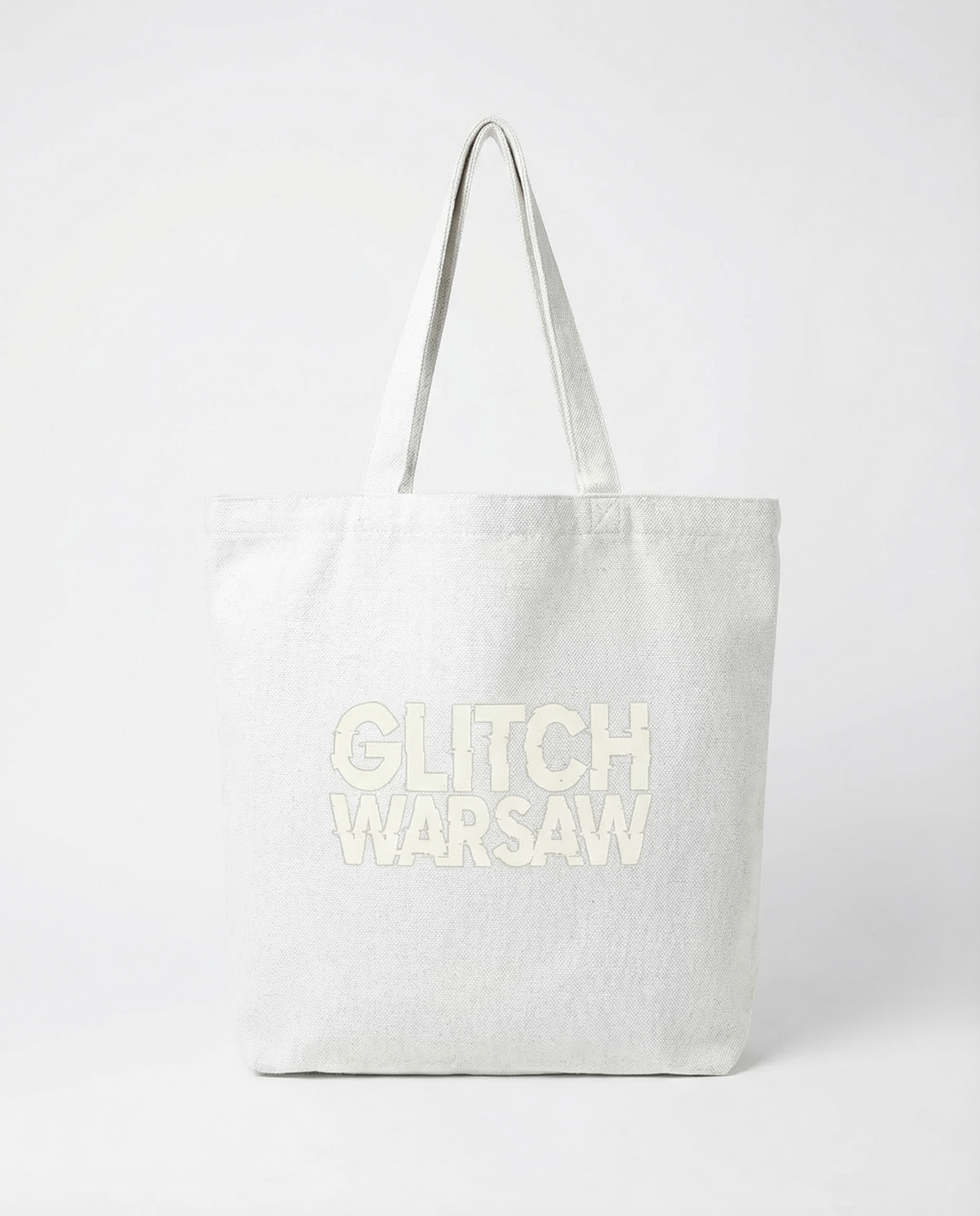 White canvas tote with tonal embossed "GLITCH WARSAW" print. Lightweight for everyday carry. Natural cotton.