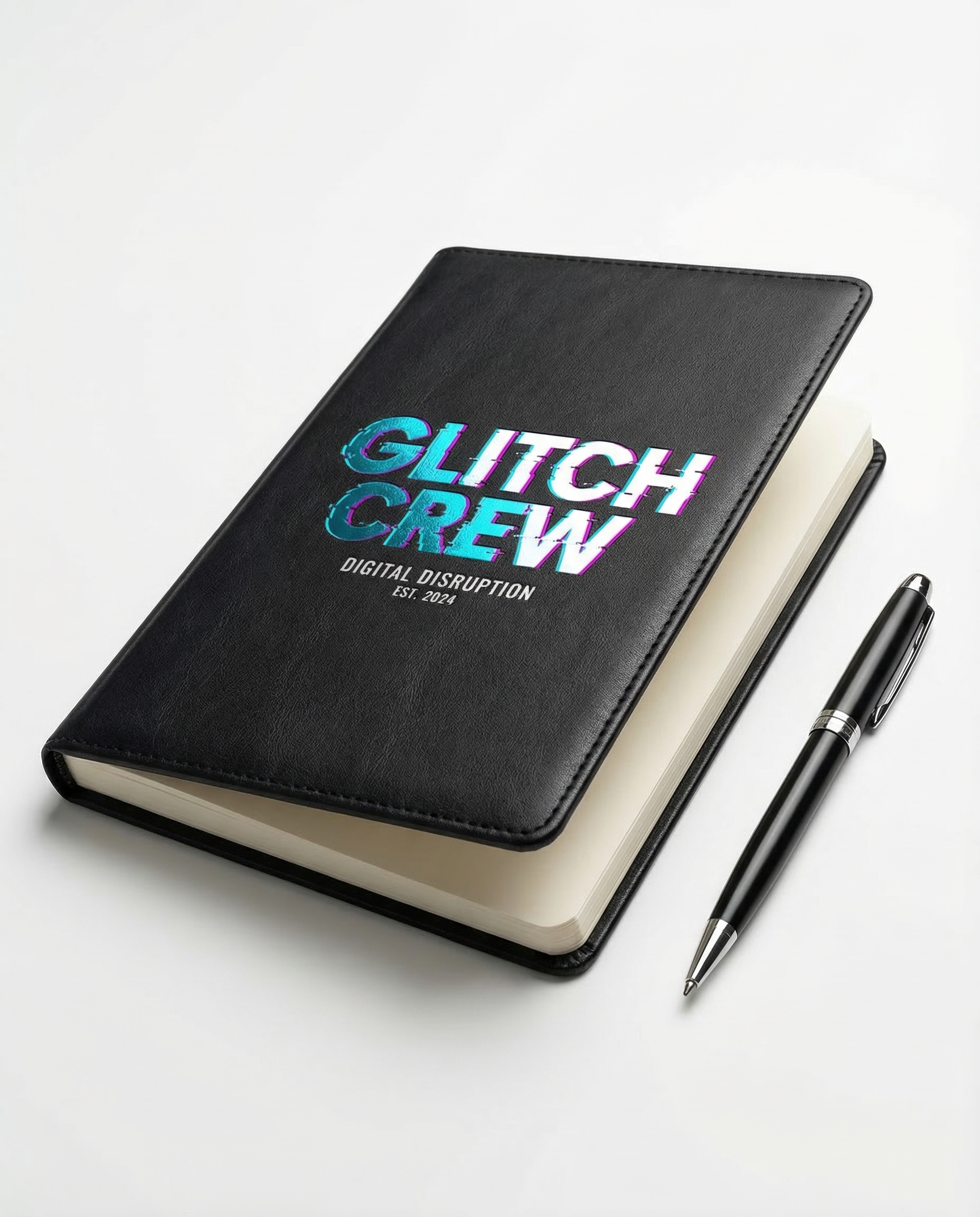 A5 hardcover notebook in black faux leather with glitch-effect "WARSAW GLITCH CREW" foil stamp in cyan. 192 lined pages. Ribbon bookmark. Comes with matching pen.