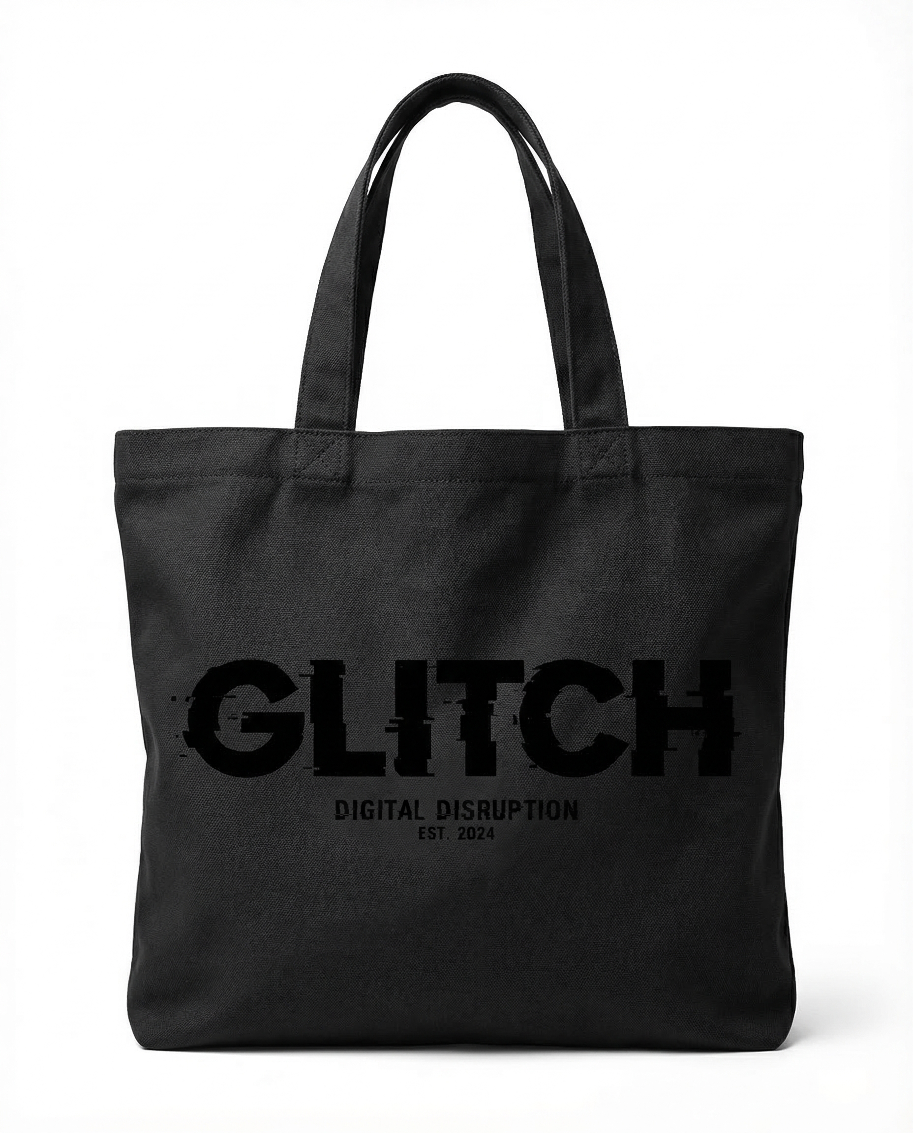 Black canvas tote with "GLITCH — Digital Disruption Est. 2024" print. Sturdy 12oz cotton. Generous size for carrying festival swag and laptops.