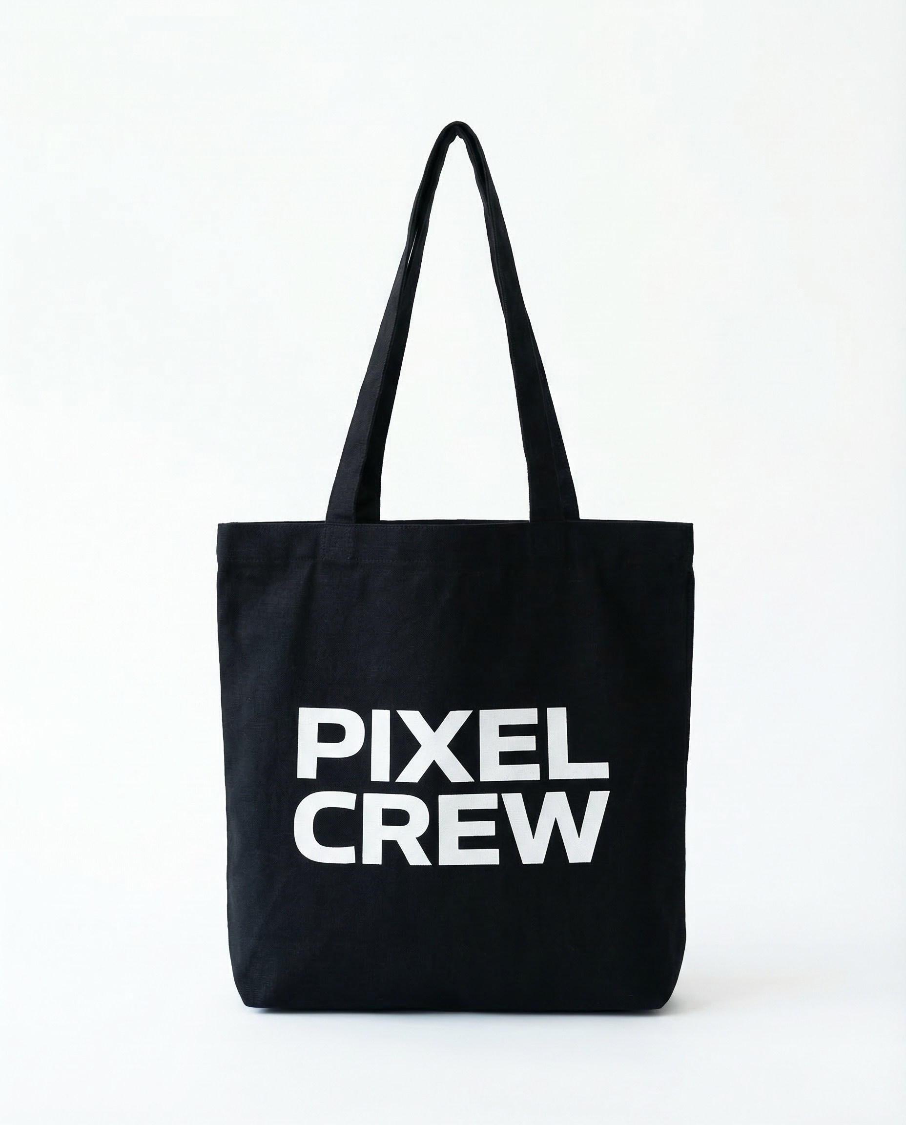 Black heavy canvas tote with bold white "PIXEL CREW" screen print. Internal zip pocket. Reinforced cotton handles. Perfect for festival essentials.