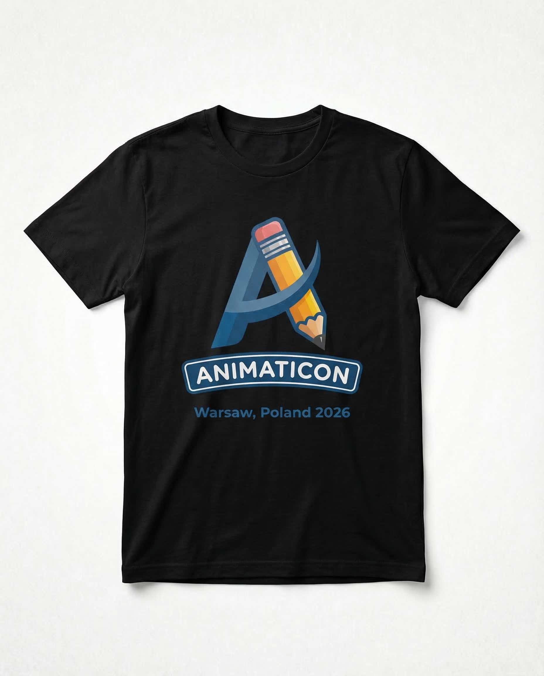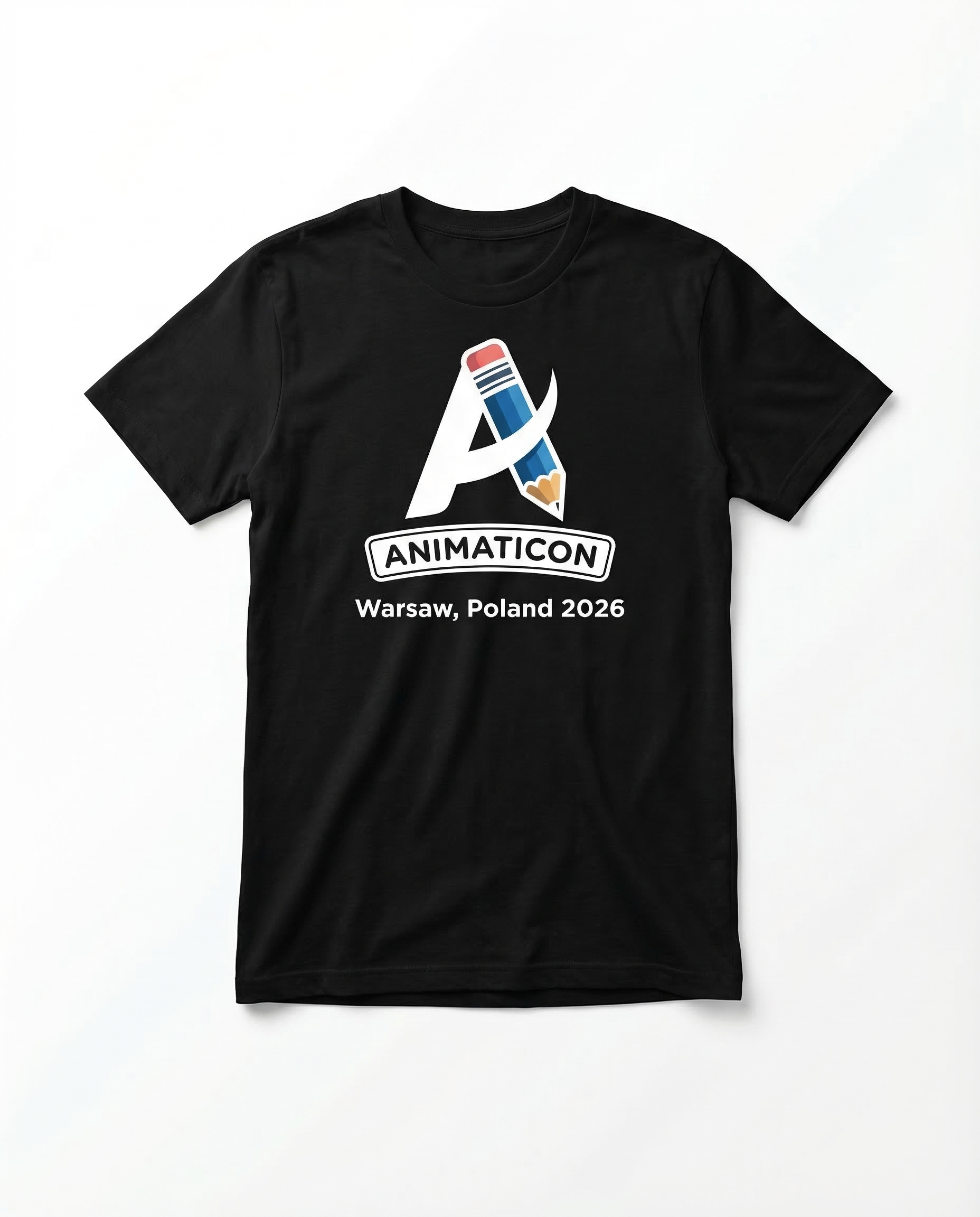 Black cotton tee featuring the Animaticon pencil logo with "Warsaw, Poland 2026" print. Official animation competition merch.