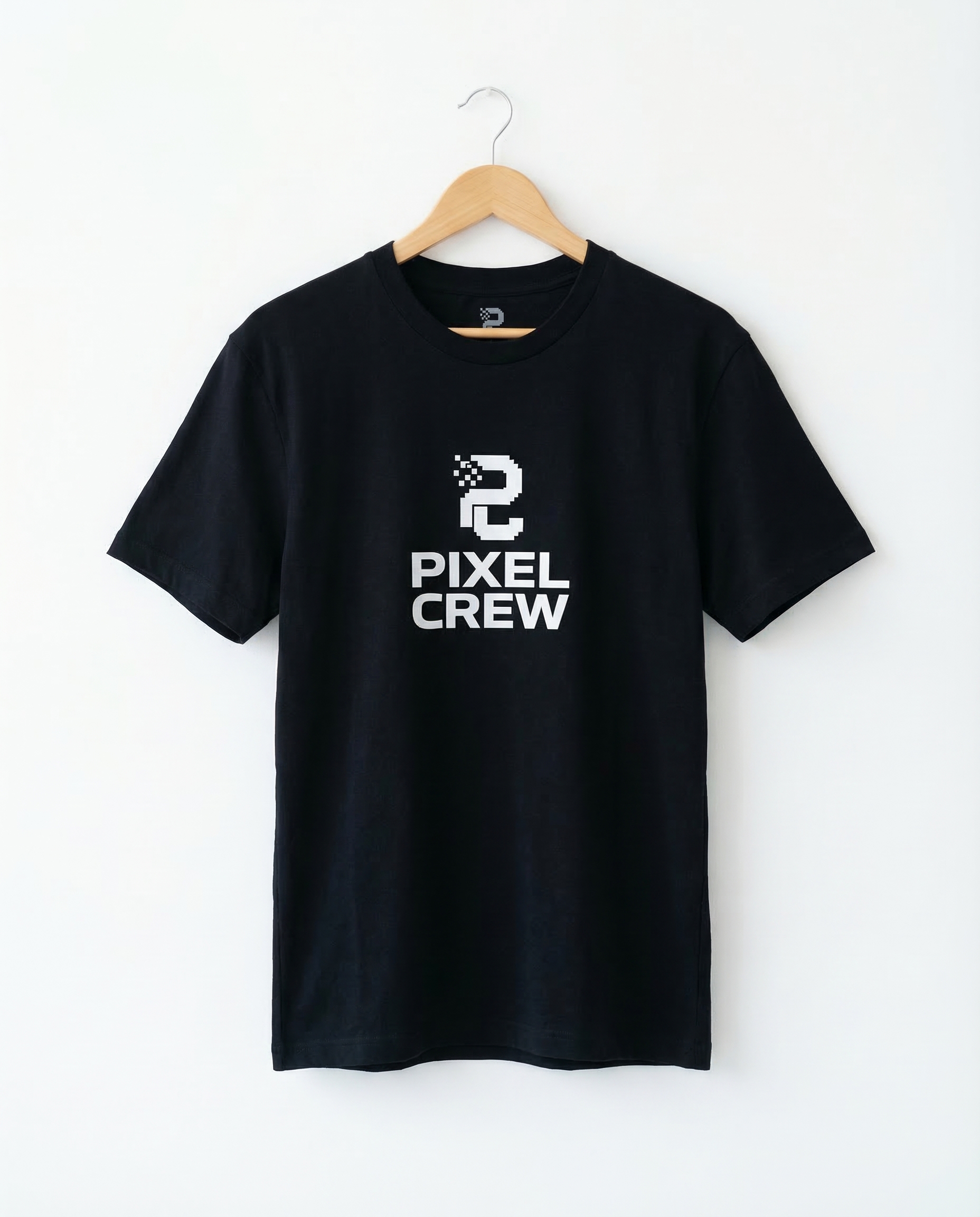 Black premium cotton tee with pixel art logo and "PIXEL CREW" print. Screen-printed front graphic. Unisex regular fit.