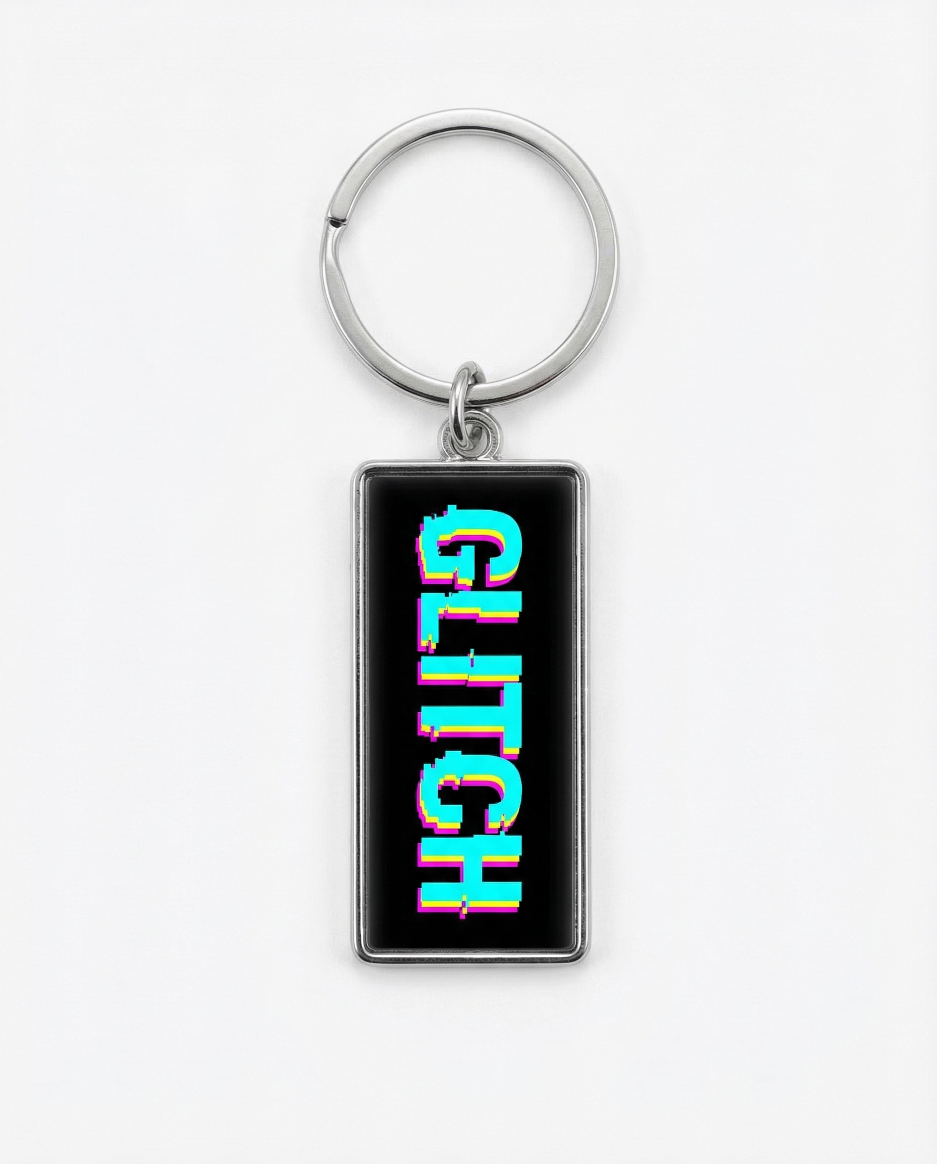 Die-cast metal keychain with cyan/magenta/yellow WARSAW GLITCH logo on black enamel. Vertical design. Chrome ring attachment.